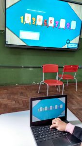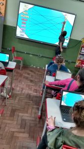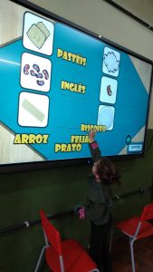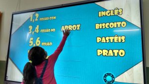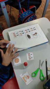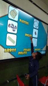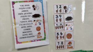 A diversão não ficou só na tela! Para a nossa missão fora da plataforma, montamos a parlenda com figuras. Tínhamos que ler as palavras, como “1,2 feijão com arroz”, e encontrar as figuras correspondentes. Foi um quebra-cabeça gigante que nos fez usar a visão e a leitura para construir a nossa história. O aprendizado ganhou uma forma nova e muito mais tátil!
