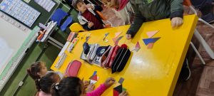 Depois de montarem as figuras na tela, partimos para a ação com os tangrans físicos! A dinâmica foi fantástica: enquanto um aluno montava uma figura na lousa digital, os colegas reproduziam a mesma figura com as peças de madeira em suas mesas. E, claro, a turma também teve a liberdade de soltar a criatividade e criar seus próprios desenhos. Uma verdadeira ponte entre o mundo virtual e o físico!