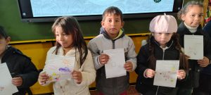 A diversão não parou por aí. Depois de dominarem o teclado com a ajuda de adesivos mágicos, eles viraram artistas. Cada um escolheu seu desenho favorito do jogo e o recriou no papel.