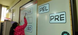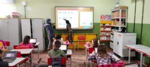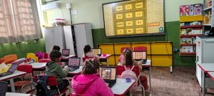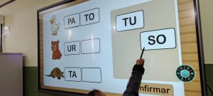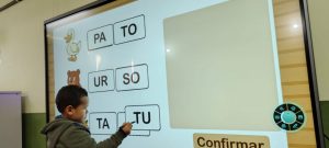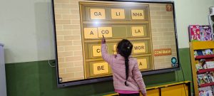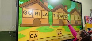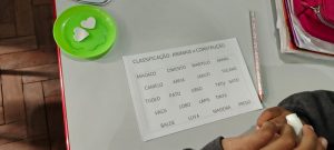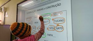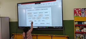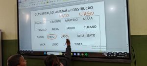 Após a exploração na plataforma, a atividade continuou com um desafio de classificação de palavras. Projetamos as palavras de animais e materiais de construção na tela digital e, enquanto as crianças encontravam e liam a palavra em sua folha, elas iam à tela para circulá-la com a cor correspondente.