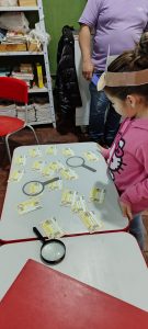 Com chapéus e lupas, as crianças se tornaram detetives e seguiram pistas para resolver enigmas. O jogo funcionava assim: