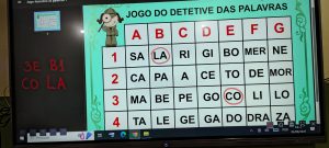 • O detetive escolhido pegava uma ficha com um enigma, de juntar as sílabas de acordo com a posição da sílaba, seguindo a ordem da vogal e do número na tabela.