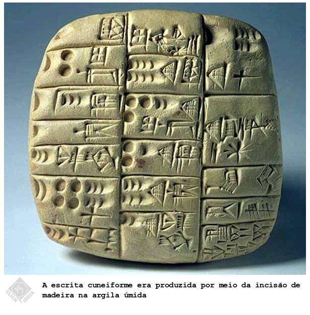 A primeira forma de escrita de que se tem conhecimento foi a chamada “escrita cuneiforme”, desenvolvida na região sul da Mesopotâmia, onde atualmente fica o Iraque. O termo “cuneiforme” deriva do latim “cuneus”, que significa “cunha”. Essa escrita era realizada por meio da incisão de madeira na argila úmida, dando-lhe forma de símbolos. A princípio, esses símbolos serviam para registrar acordos comerciais, negociações de paz e registros matrimoniais. Mas pouquíssimas pessoas dominavam essa técnica. Elas recebiam o nome de “escribas”, que geralmente estavam a serviço dos governos locais e eram extremamente relevantes naquelas sociedades. O domínio das primeiras técnicas de escrita exigia muito tempo de preparação.
